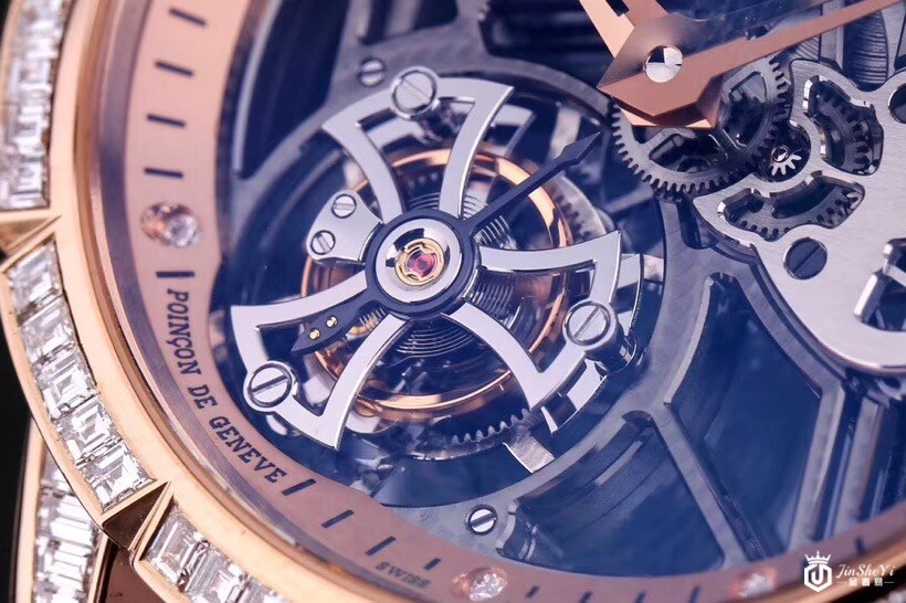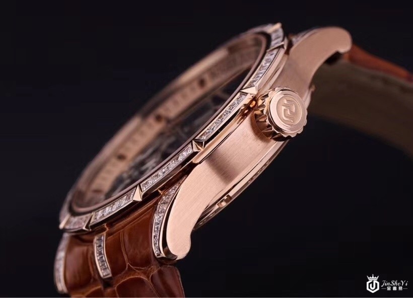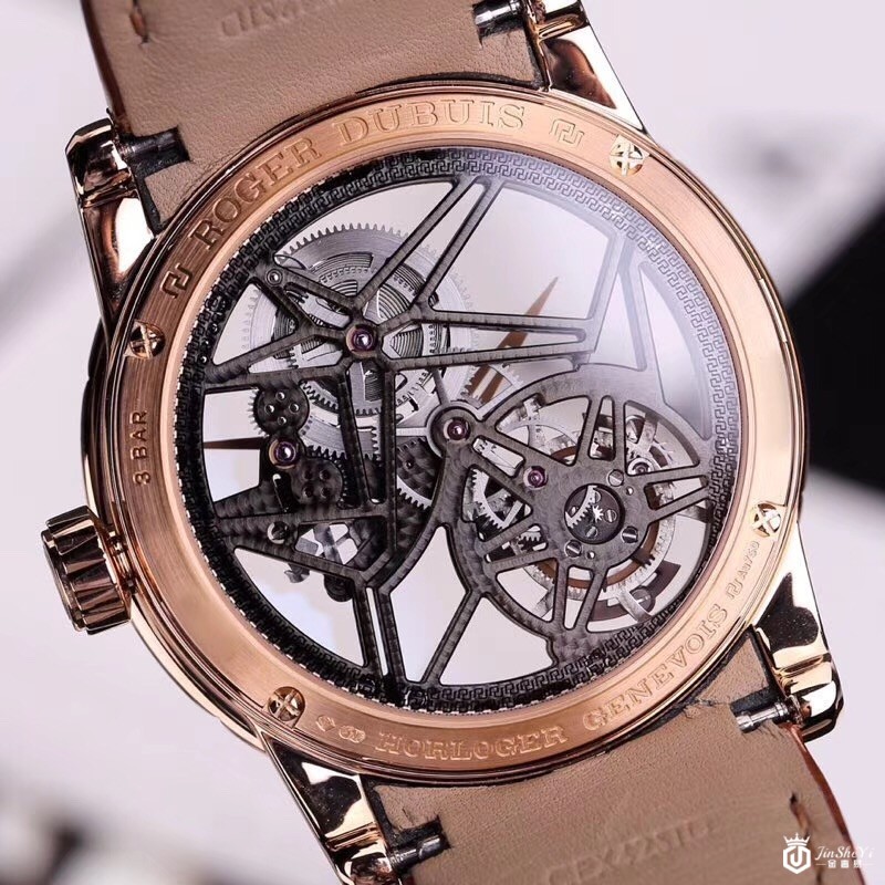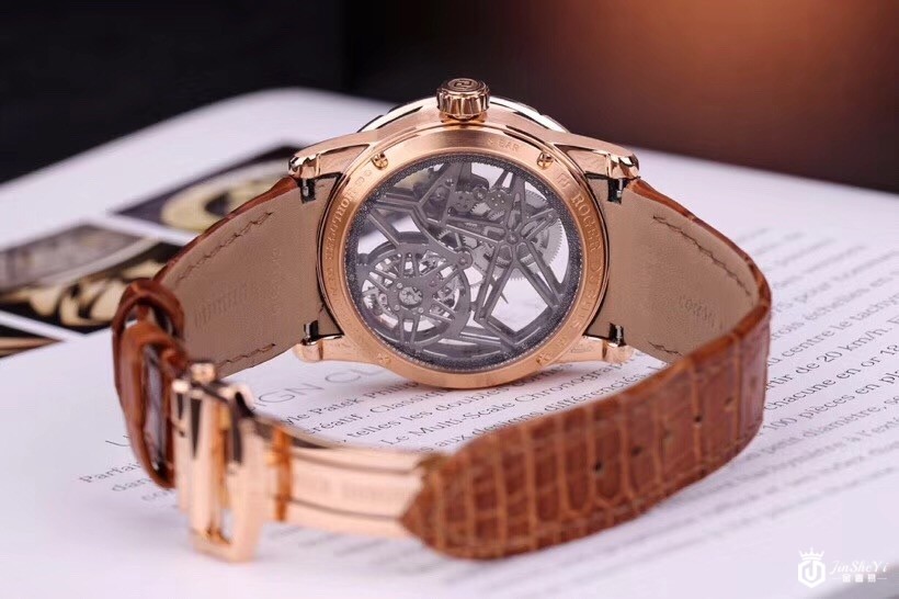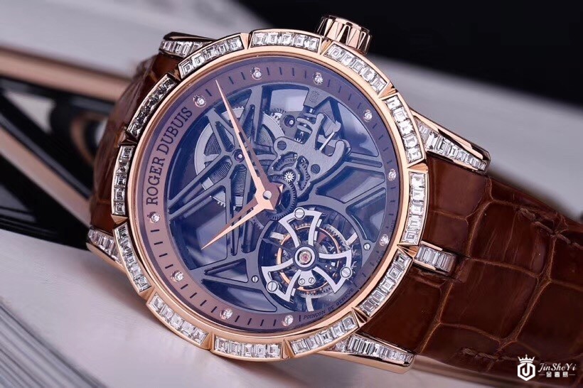 罗杰杜彼RDDBEX0418Excalibur 42首饰骷髅飞行陀飞轮,玫瑰金镶钻表壳,镂空表盘,棕色皮表带,玫瑰金折叠表扣,陀飞轮。表壳呈圆形几何形状,由18K玫瑰金制成,直径42.00毫米。外缘的闪光和光泽提供长方形和经典切割钻石(重2.77克拉)。豪华表圈增强了镂空表盘的美感,展现了复杂时钟机制的工作和完成。表盘的中央区域有两个由玫瑰金制成的镂空指针。腕表采用优质的PoinçondeGenève品牌。搭载RD505SQ手动机芯。提供60小时的动力储备。