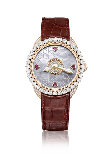 白色珍珠母贝表盘镶嵌70颗圆形明亮式切割钻石,每个刻钟亦镶有4颗心形红宝石。表盘展现心心相扣的设计,颂扬维多利亚女王(Queen Victoria)和亚厘毕亲王(Prince Albert)的永恒爱情故事,其心心相扣的标志也让人联想起优雅妩媚的维多利亚系列。