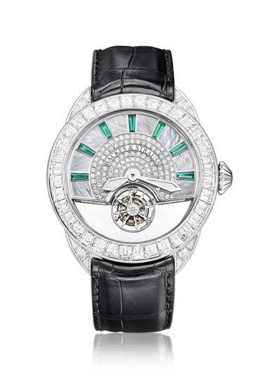 一如Emperor系列,镂空表盘呈现专门订制的陀飞轮,上方缀以BACKES & STRAUSS的经典箭形图案,灵感来自在特制放大镜下观赏理想切割钻石时所见的心箭图案。白色珍珠母贝表盘镶嵌138颗理想切割白钻,时标位置另缀7颗长阶梯形切割祖母绿。