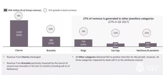 11月7日,丹麦轻奢珠宝王潘多拉Pandora A/S 公布了三季度财报,数据显示其彻底“凉凉”了。在截至9月30日的3个月内,潘多拉收入同比跌3%至49.8亿丹麦克朗(约合7.64亿美元),息税折旧摊销前利润率则从上一年同期的37.8%减少至29%,净利润为9.51亿丹麦克朗(约合1.45亿美元),其中中国内地消费约占品牌的11%。同时,潘多拉也下调了对2018年业绩的预期,全年增长的期望区间由原来的7%至10%调整为2%至4%。