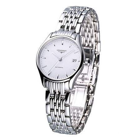 浪琴律雅系列L4.760.4.12.6腕表,这块手表配有Cal.L619自动机械机芯,精钢圆壳的直径是35毫米。白色表盘仅嵌入了时间指示器。窗户在三点钟打开,显示日期。手表采用耐磨蓝宝石水晶玻璃镜,配有细钢链带和折叠扣环。这款手表的底部非常致密,防水深度可达30米。