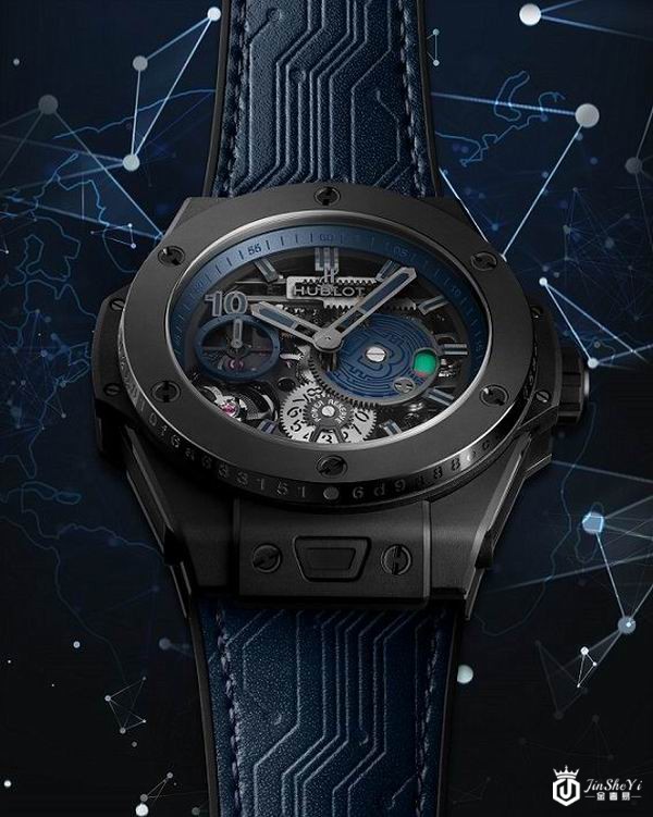此次宇舶发布的、试水区块链技术的Big Bang Meca-10 P2P腕表,限量210枚。腕表延续Big Bang系列的创新设计并融合区块链技术。腕表配有以微喷黑色陶瓷制成的45毫米表壳,搭载动力储存长达10天的HUB1201自产机芯。因每一枚腕表表圈外沿都镌刻特别认证编号,使210枚腕表每枚都独一无二。此外,蓝色小牛皮配黑色的橡胶表带上的装饰灵感来源自区块链网络,以互相连接的电子终端图案向区块链技术致敬。
