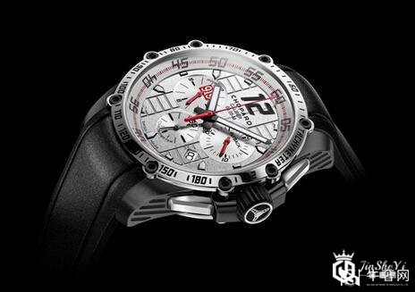 此款计时码表采用钛金属制作并经过DLC处理,表壳直径45毫米,具备飞返功能(flyback)。内部搭载荣获瑞士官方天文台(COSC)认证的萧邦自 制03.05-M机械机芯。表款自保时捷919 Hybrid混合动力赛车汲取灵感,表盘的条纹设计借鉴赛车的后散热器。同样,9时位置的计时盘红色矩形框中饰有“919”标志,象征出战世界耐力锦标赛 的保时捷赛车。这枚腕表防水深度达100米,其配备的橡胶表带酷似高速转弯表现优异的光头轮胎。