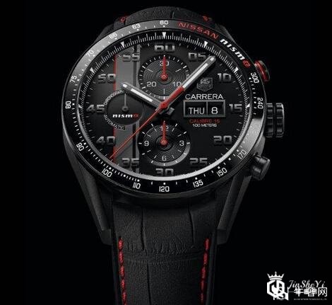 黑色表盘配以木炭灰色和红色指针,以钛金属制成,喷射钛制碳化物,重量极轻却比精钢坚固。搭载以稳固和恒久动力著称的Calibre 16机芯,防刮伤陶瓷表圈,表盘上配有转速表用以测量平均速度。表壳两面的弧形蓝宝石水晶经过防炫目处理,背面表壳镶贴Nissan NISMO标志。表带以红色车边装饰手感细腻的磨砂鳄鱼皮,防水深度100m。