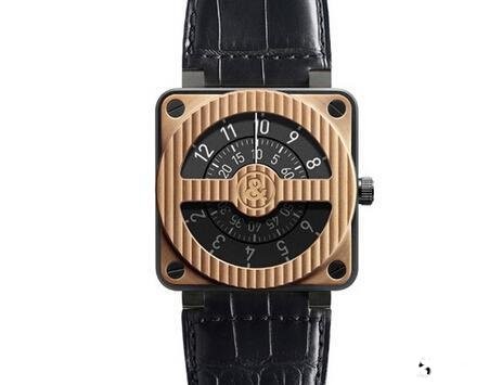 BR 01 Compass黄金罗盘限量腕表,以导航罗盘为灵感的时间显示方式:表圈分为上下两半,由两独立同轴心转盘分别为12小时与60分钟走时,表镜上半部的中 央白色直线与不停旋转的转盘相对应,可指示出时间,虽特殊却清晰易懂。玫瑰金与黑钢的表壳设计,搭配波浪切纹的玫瑰金表圈,让阳刚霸气中带有柔顺的美感。 表面下半部的透过较深色的透视窗,可一窥碟盘的规律转动,崭新的时间显示带来简单的趣味,有了跳脱传统的惊喜!