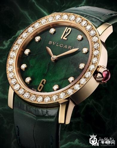 33毫米玫瑰金或白金表壳与12小时刻度,合共镶嵌54颗圆形明亮式切割钻石;表冠镶有一颗宝石,与绿色翡翠面盘和鳄鱼皮表带的色调相互辉映。另备有白金款式以供选择,圆形表圈彷如罗马万神殿大理石圆柱,又似古罗马建筑柱廊的剖层,选用现代风格揉合经典元素作为设计概念,色彩丰富,进一步彰显其设计与质量乃出自珠宝商之手。