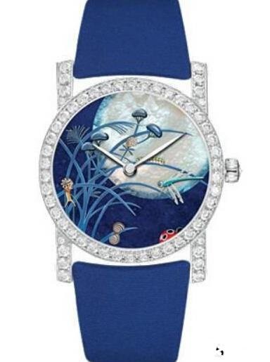 蜻蜓飞舞嬉戏的情景使得表盘极具观赏价值,CHAUMET别出心裁将整块蓝宝石水晶玻璃作为表盘材质,通过手工绘以珊瑚色与蓝色相间的蜻蜓及绿色装饰带,勾画出了活泼朝气的场景。表盘的玻璃底盖则绘有一层象牙白色漆,使得蜻蜓的倒影显现在表盘之上,精妙的设计令人称赞不已,整个表盘的微绘工艺全部由手工完成。