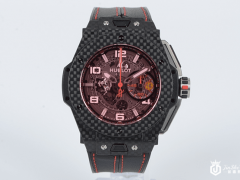 带有宇舶表Big Bang系列招牌的镂空表盘设计,在表盘3点钟方向可见艺术家Shepard Fairey的五芒星Logo,表款搭载HUB 1201手动上链机芯,具有10天的长动力储能,透过镂空表盘,可见以223枚零件所组成的机芯运作情况。这只Big Bang Meca-10限量表具有动力储能双显示功能,除了6点钟方向的动力显示盘,另外当动力仅剩高最后二天,在3点钟方向Shepard Fairey五芒星logo位置上也会逐渐显露红点,提醒佩戴者该为表上链了。