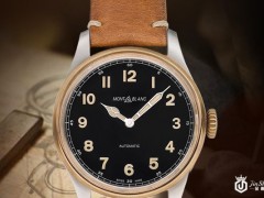 万宝龙1858系列手表,青铜元素的融入,使得这款手表偏军事风格。精钢打造的表壳搭配青铜表圈,奥妙的色泽搭配,将层次感表现的更加明显。烟黄香槟色表盘搭配大教堂风格指针和铁轨式分钟刻度圈,这些细节设计都展现着其复古情怀。手表表背镌刻有勃朗峰山脉图案、一个罗盘和二把相互穿插的冰镐,向我们传达出万宝龙品牌的探险精神。