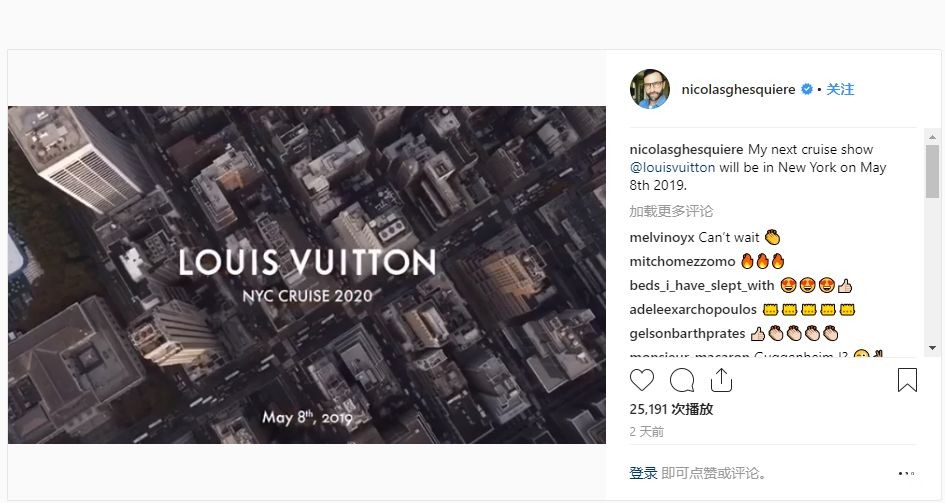 据wwd报道:Louis Vuitton女装系列总监NicolasGhesquière在其个人Instagram页面上表示其将于明年5月8日在纽约举行LV 2020早春女装系列时装秀,具体地点尚未公布。