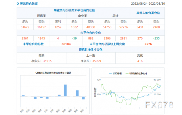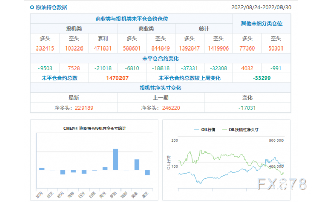 nload='javascript:if(this.width>500)this.width=500' align='center' hspace=10 vspace=10 rel='nofollow'/>(原油持仓数据) 据计算和美国商品期货交易委员会(CFTC)公布的数据,最近一周投机客持有的美元净多头押注有所增加。截至8月30日当周,美元净多头头寸从之前一周的137.9亿美元增至142.1亿美元。芝加哥国际货币市场(International Moary Market)的美元仓位是根据日元、欧元、英镑、瑞郎、加元和澳元这六种主要货币的净仓位计算得出的。