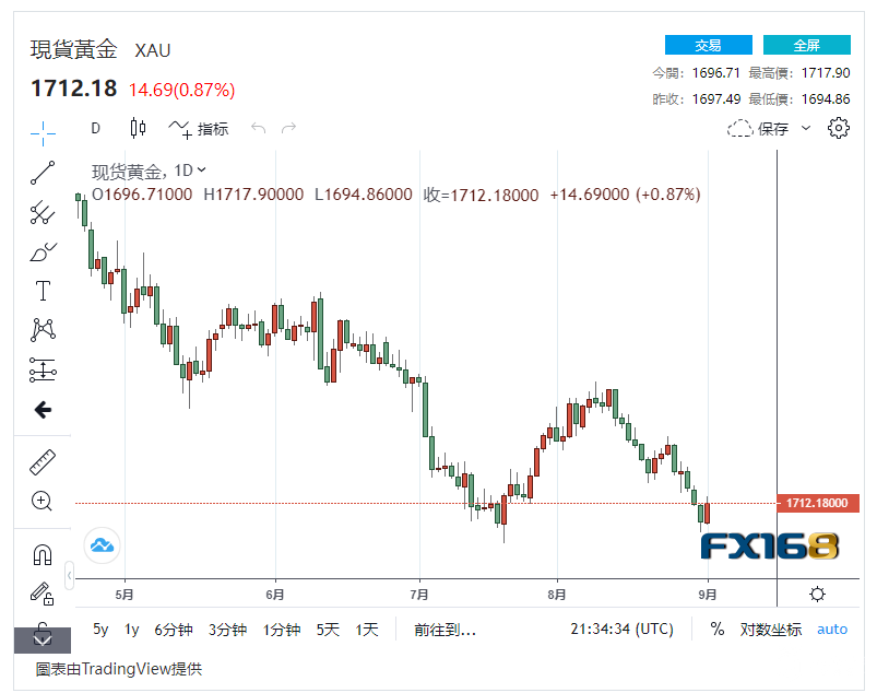美市尾盘,现货黄金收报1712.18美元/盎司,上涨14.69美元,涨幅0.87%,日内最高触及1717.91美元/盎司,最低触及1696.11美元/盎司。