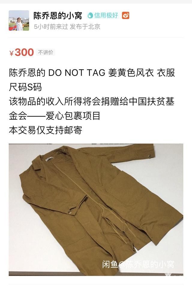陈乔恩也是,她的闲鱼账号叫“陈乔恩的小窝”,来闲鱼不到1年时间,已经卖出71件宝贝,出售的大多都是她的闲置衣物,所售商品的收入也都捐赠给中国扶贫基金会的爱心包裹项目。