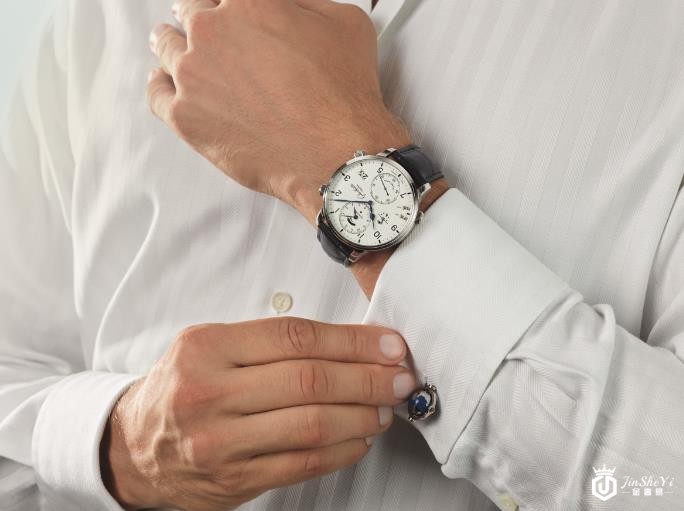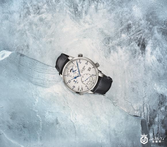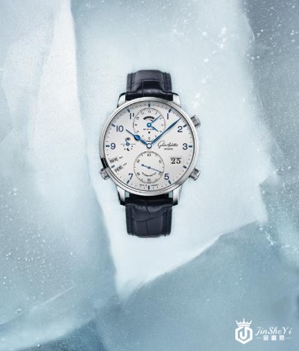深蓝与白,点缀黑色细节——属于冬天的色彩,定下腕表的总体视觉基调。12 点钟位置的银框子表盘指示原住地时间,同时集成了动力储存显示。格拉苏蒂原创代表性的大日历设于4 点钟位置;8 点钟位置设计两个箭头形窗口,与表盘的整体轮廓线条和睦相融。它们使用国际航空运输协会 (IATA) 制定的国际机场代码,三种不同颜色,指明旅行者目的地。根据GMT(格林尼治标准时间)划分的 24 个时区 (相邻时区之间时差为1 小时) 中的每一个都由一个黑色的IATA 代码来表示;另有半时区8 个,以蓝色代码表示;还有 3 个时区与 GMT 时间相差三刻钟,以红色 IATA 代码表示。9 点钟位置是全新设计的日/夜显示,分别以小太阳和繁星闪耀的夜空来表示白昼与黑夜。