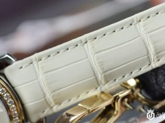 偏心月相女士腕表的迷人魔力同样源自清爽纯粹的细节。精致的珍珠母贝表盘宛如冬景里冰冻的湖泊——能映出澄净清澈的天空来。如此光彩迷人的娇颜是格拉苏蒂原创位于德国普福尔茨海姆的自有表盘厂之高超手工技艺的结晶。此外,4点钟位置的大日历以及2点钟位置的月相显示亦是制表匠人的巧手杰作——钻石切割的银色月亮,繁星璀璨的美丽夜空,栩栩如生的刻画引人如痴如醉。大日历显示虽说是格拉苏蒂原创炉火纯青的代表特色,但在女士机械腕表中是鲜少使用的,足见其珍惜难得。