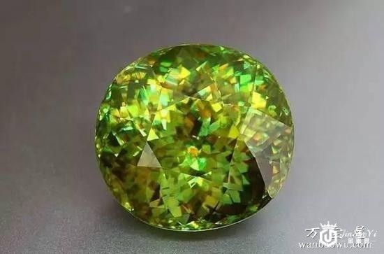 如果宝石的色散值过高会出现什么情况呢? 合成宝石:金红石(0.330),莫桑石(0.104),立方氧化锆(0.056-0.066)色散比天然宝石都非常多,金红石是所有宝石中色散值最高的,即使不用切割,它的光芒已足够耀花眼,闪到俗不可耐了。 而色散值过低比如水晶(0.013),无论多么纯净透明的水晶搭配何等高超的切工,它都无法产生火彩的效果。 我们欣赏下火彩明显的宝石: 翠榴石,硬度6.5-7,火彩很明显,英文名字Demantoid,意思是“像钻石一样”。稀有,价格昂贵,硬度偏低难以保养。真是越漂亮的生命越脆弱。