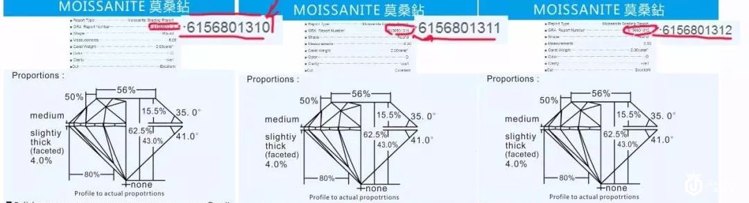莫桑石(碳化硅的一种),市场上大部分莫桑石均为人工合成,天然莫桑石非常稀少,仅出现在陨石坑内。莫桑石的外观与天然钻石很相似,也是物理特性接近天然钻石的一种半宝石。合成碳硅石(莫桑石)是钻石的模仿者之一,低廉的价格,钻石的外观使合成碳硅石(莫桑石)迅速流行起来!据悉,在广州、深圳、江苏东海、广西梧州珠宝市场中有的商户一天能出货几百克拉!而随着合成碳硅石(莫桑石)的流行,市场也出现了越来越多的合成碳硅石(莫桑石)分级证书!据了解我国没有“合成碳硅石(莫桑石)分级标准”,市场上的莫桑石分级证书全部是境外机构的,而且绝大多数都是山寨“国际权威检测机构”的分级证书!1、广西梧州的“全球宝石学权威GRA”莫桑石分级证书——证书批量印刷这个号称“全球宝石学权威”(Globalgemological Rearch Authority)的莫桑石研究机构简称GRA,官网:www.grareport.com,在其证书上标明在全世界(除中国大陆地区外)著名城市均设实验室。连续检索了梧州GRA机构的50个连号的莫桑石分级证书,编号分别为:NO:6156801301~NO:6156801350 结果发现这50个证书除了证书编号不同,其余所有的检测数据均一模一样,并且切工比例不差分毫!更让人惊讶的是编号为NO:6156801312竟然有“一号两证”,两证书的日期不同,其余参数均相同!所以这些“检测机构”实际上就是印刷厂,批量制证,统一打印“腰码编号”!2、“全球宝石学研究协会GRA”—— 机构名称拼写错误“全球宝石学研究协会(GLOBALGEMOLOGICAL RESEARCH ASSOCIATION)”简称(GRA),官网:www.gra-assiociation.com。而其证书封底上的“GEMOLOGY(宝石学)”错拼成了“GEMPLOGY”。该机构官网,关于自己介绍中:“GEMOLOGICAL(宝石学)”被拼成了“GEMOLODICAL”,和“梧州GRA”一样:同一规格尺寸莫桑石的证书分级数据完全一致!3、香港國際寶玉石檢測協會(IGTA)和国际合成碳化硅协会(IMCA)——共用一个热线电话登录香港國際寶玉石檢測協會(IGTA)和国际合成碳化硅协会International Synthetic SIC Consultant Association (IMCA)两个机构官网,你会发现两家的检测热线是同一个电话400-7755-223。而且其证书也是跟上面两家的一样,同样规格的检测数据均相同。山寨的莫桑石分级证书还有很多,这些只是冰山一角。还有什么“香港BIA证书”、什么“国际GIR证书”等等。钻石与莫桑石的区别①火彩:钻石的昂贵源于其独有诱人的火彩,色散指数(火彩)0.044,而莫桑石高于钻石的色散指数(火彩),高达0.144,在不同的环境中呈现的火彩闪烁高于钻石,且呈七彩色(如果用来仿钻石,就会给人一种“有点假”的感觉)。②比重:莫桑石比钻石轻,即它们的比重不同,钻石的比重为3.52,而莫桑石的比重仅3.22。对未镶嵌的材料,用甲基碘比重液(比重3.32)很容易将两者区分。③硬度:莫桑石的硬度小于钻石,因此用钻石硬度计在莫桑石表面作刻划试验会留下划痕,而刻划计不会在钻石表面留下划痕。④导电性:据GIA的报告,80%的莫桑石均为电导体(天然钻石中仅蓝色、蓝灰色IIb型钻石具导电性)。常见的白/浅黄色系钻石是不导电的,因此可用电导仪鉴别钻石与莫桑石。⑤折光率:此外,莫桑石具双折射,因此仔细观察不难看出莫桑石棱线及底尖的重影,此时变换观察角度,重影仍会出现。⑥抛光纹:莫桑石的腰部抛光纹相互平行,这与钻石完全不同。而且由于不同方向的差异,钻石抛磨过程中要不断调整抛光方向,而莫桑石可沿同一方向抛光。这一点在相邻刻面间尤为明显。⑦切割:大多数已切割的莫桑石其棱线均较为圆钝,这与具尖锐棱线的钻石完全不同。⑧内含物:钻石的内含物与莫桑石内含物不同。所有鉴定过的莫桑石中都有一些内含物,它们呈针状平行排列。一些莫桑石内可见细的平行排列的反射线。高碳钻与莫桑石的比较高碳钻是里利用现代高科技离子迁移技术对非晶质碳(钻石)离子进行迁移融合,离子重组,从而生产的一种新形人工混合型钻石。此技术生产出来的晶质钻可以直接切割打磨,经过切割后的高仿合成钻石的火彩与质感均已达到天然钻石的标准,是目前市面上很好的钻石替代品。△高碳钻而莫桑石的主要成分是碳化硅,且上文也有提到,莫桑石的色散值比钻石高,大约是钻石的4倍,有点闪过头了,所以其火彩给人一种“有点假”的感觉。金奢易网回收公司成立于2010年,购买全新/二手名表请到金奢易网企业淘宝店铺进行选购(包括全新/二手名表)! 专注于全新/二手名表、名包、黄金、钻戒等奢侈品回收、鉴定、寄卖、置换、典当、抵押、保养、维修服务。多家实体店铺,线上线下资源结合,近十年经营已积累数万忠实客户,年奢侈品交易量破十万件,当场交易,快捷变现,全国上门回收!目前力争是国内最大的综合性回收公司!