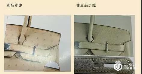 正品Hermes的走线都是斜纹线,不会有直线混搭的情况,有则必假。另外正品的针眼整齐细腻,仿品的针眼较大且边缘不规则。