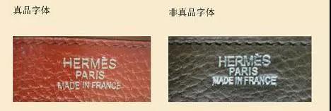 正品Hermes的皮质logo为手工拓印,不一定都严丝合缝,但一定字母清晰没有晕染。做工差的假货是整个Logo用钢印一下压出来,不是按照一个个字母的,这类就会有横向的条纹;做工好点的超A货是一个个字母压出来,但边缘浅字母粗。
