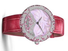 这款手表的直径为35.8毫米,对于女性来说尺寸恰到好处,衬托出纤细的手腕。表壳上以多排错层方式镶嵌亮堂式切割钻石,并且以色彩浓度深浅不一的亮堂式切割蓝色蓝宝石点缀其中。镶嵌的钻石均为顶级威塞尔顿钻石,经过严格的切割和镶嵌,细节上十分讲究。表盘采用的是珍珠母贝材质,并且以手工雕刻的精巧蓝色羽毛图案进行装饰,雕饰精巧的白金叶形时针和分针和盘面相互衬托,尽显女性典雅华美的一面。盘面高半局部采用雪花”镶嵌,蓝色蓝宝石和钻石相互辉映,十分精巧。这款手表价格非常,用料珍贵,回收价格超公价也是非常正常事情。