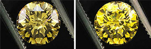 如上图中,左图的纯净度虽然比右图高,但右图中更加饱满和浓郁的颜色决定了它的价格完胜左图黄色钻石价格。左图均价在10万左右,而右图约为15万左右。