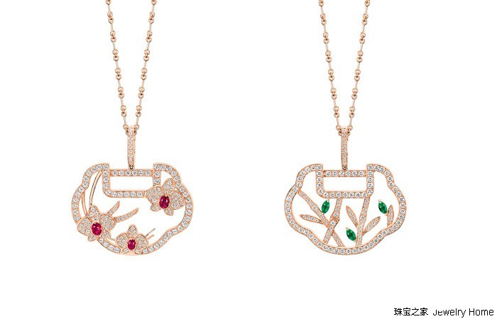全新YuYiFlowerMoon系列珠宝,均以巧心构思、精湛工艺和珍贵的宝石打造而成,演绎出流光溢彩的融合美学。4款造型各异的项链,依托钻石、红宝石、绿宝石及粉红蓝宝石的精巧密镶和18K玫瑰金,共同呈现兰、竹、樱、莲惟妙惟肖的的形态。当光线从花朵枝丫的缝隙纹路中透出,光影律动间,YuYiFlowerMoon系列珠宝好似正迎风沙沙作响,即刻变得灵动富有生命力,闪耀不息的盎然之韵。