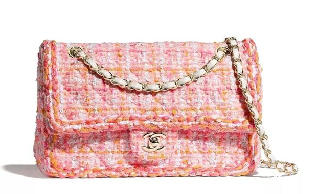 香奈儿(Chanel)粉色粗花呢链条包,粗花呢是香奈儿的一大经典元素,它常常出现在成衣系列中,却不常出现在包包设计中,因此,品牌的粗花呢手袋格纹受欢迎。香奈儿2019春夏系列中的这款粗花呢链条包很有可能成为下一季的时髦“爆款”,大颗珍珠串起的短链条尽显华丽,甜蜜粉色调的粗花呢充满少女心。