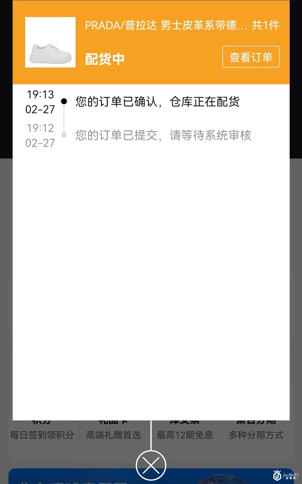 ▲寺库平台订单流程显示,杨先生2月27日购买的休闲鞋,至今仍在“配货中”。 受访者供图