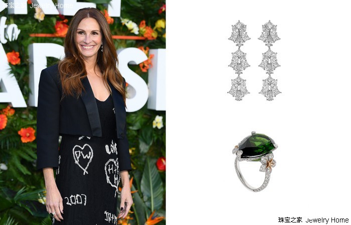 耳畔摇曳的耳环由白18K金打造,并镶嵌多颗共计10.89克拉圆形明亮式切割钻石,旖旎光晕璀璨流转。指间点缀一枚由白18K金和玫瑰色18K金打造的戒指,一颗16.99克拉梨形切割绿色碧玺石与多颗晶莹钻石镶嵌其上,光彩熠熠闪耀,彰显佳人华美之姿,举手投足间尽展优雅魅力。
