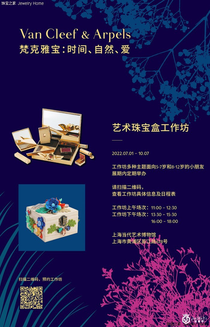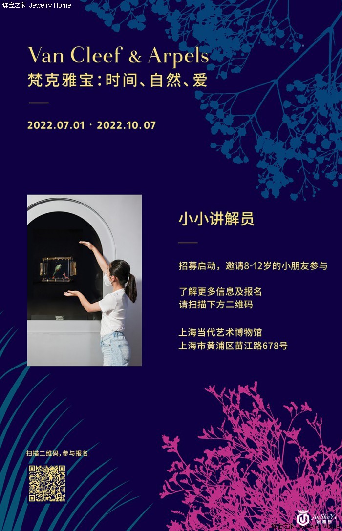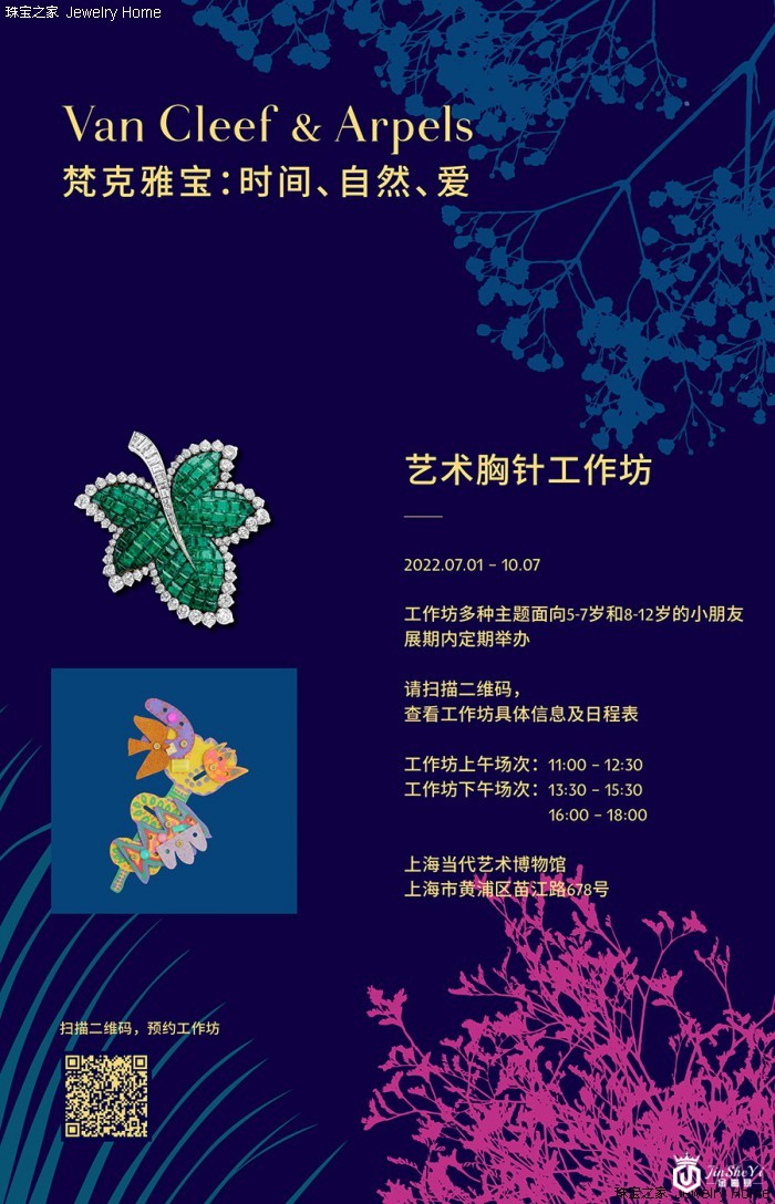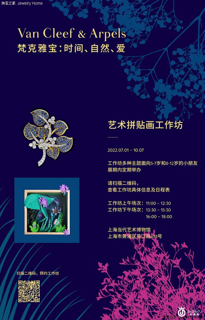 《VanCleef&Arpels梵克雅宝:时间、自然、爱》典藏臻品回顾展于2022年7月1日至2022年10月7日在上海当代艺术博物馆(PowerStationofArt)呈现。此次展览展出逾300件世家于1906年问世以来创作的高级珠宝、腕表和珍贵物件及典藏档案等,结合唯美的展陈与美术设计,一展世家百年风华。此次展览特别推出专属儿童的艺术体验活动,包括小小讲解员和儿童艺术工作坊,以雅趣相谐的互动方式,轻启儿童想象的翅膀,徜徉璀璨诗意之境的同时,开启一段对珠宝艺术领域的探索之旅。