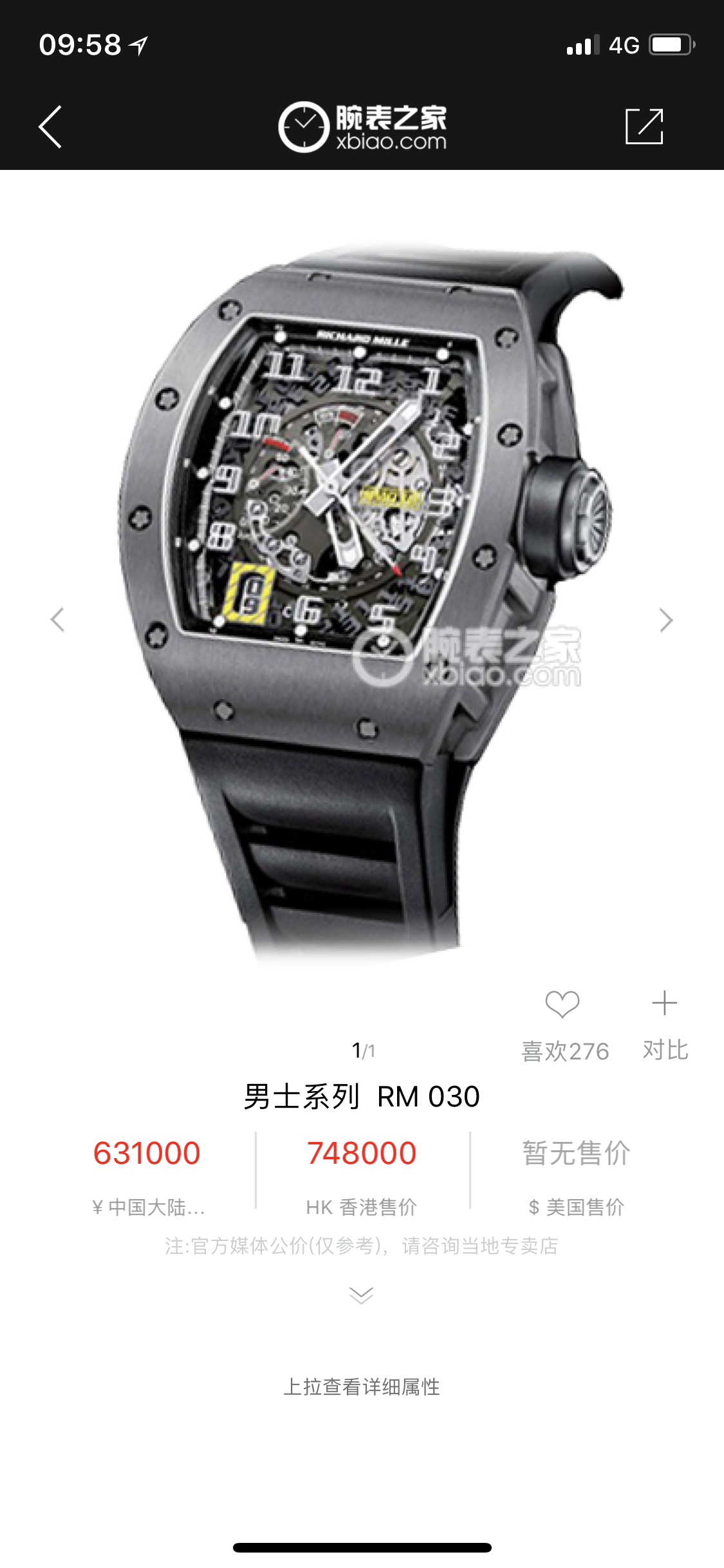 专柜售价63万港币 不知道现在是理查太火了 还是什么原因 专柜经常断货 能买到全新的得靠运气 所以二手价格也不便宜 基本在60多万