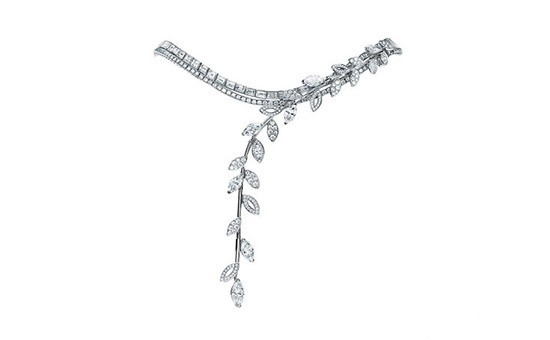该主题中的一款惟妙惟肖地演绎藤蔓自然生长之姿的项链,以重叠交织的链条模拟出蕨类植物的形态,在背后轻柔舒展。这款项链由9颗总重超过5克拉的榄尖形切割钻石,333颗总重超过5克拉的圆形明亮式切割钻石,与85颗总重超过21克拉的狭长形切割钻石打造而成,流畅的线条与铂金镶嵌混合切割钻石共同勾勒出别致典雅的轮廓。