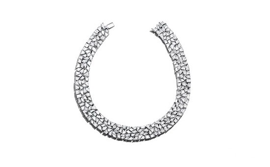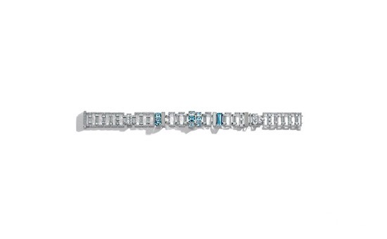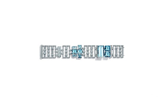 其中一款项链由总重超过63克拉的狭长形与圆形明亮式切割钻石镶嵌而成,珍罕的中彩蓝灰钻石与灰色钻石附以点缀,纹理之间大胆的几何造型感呼之欲出。