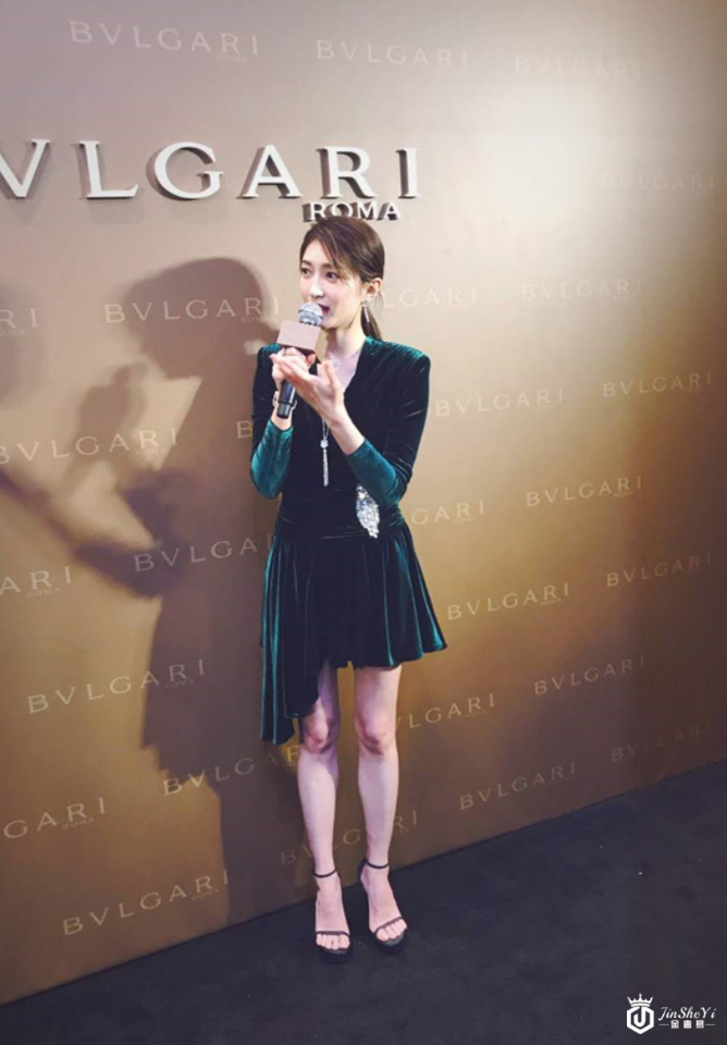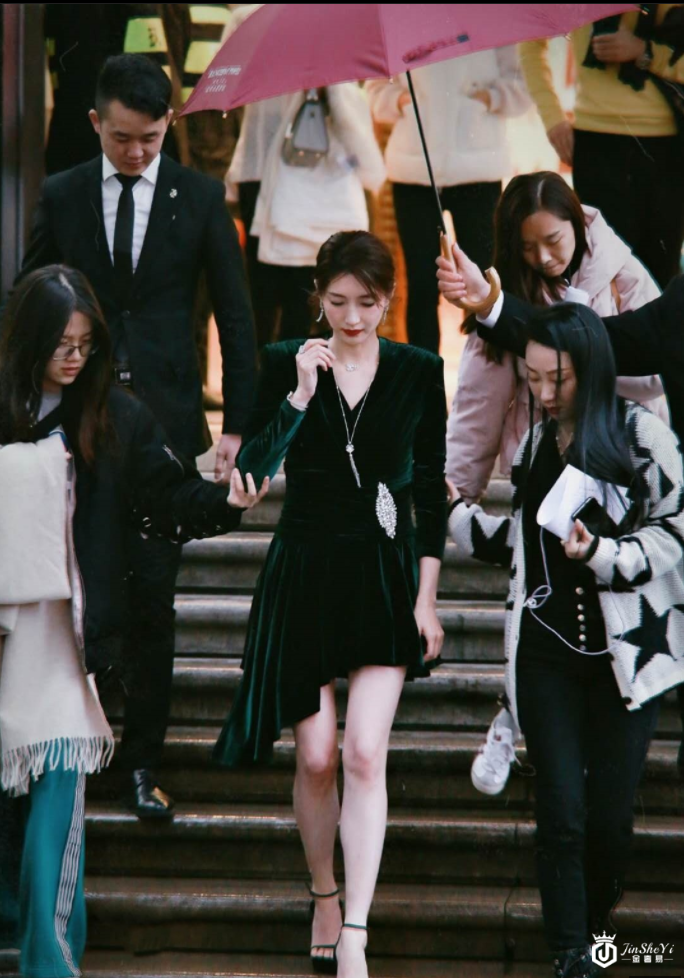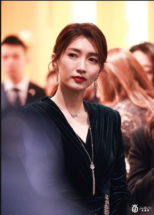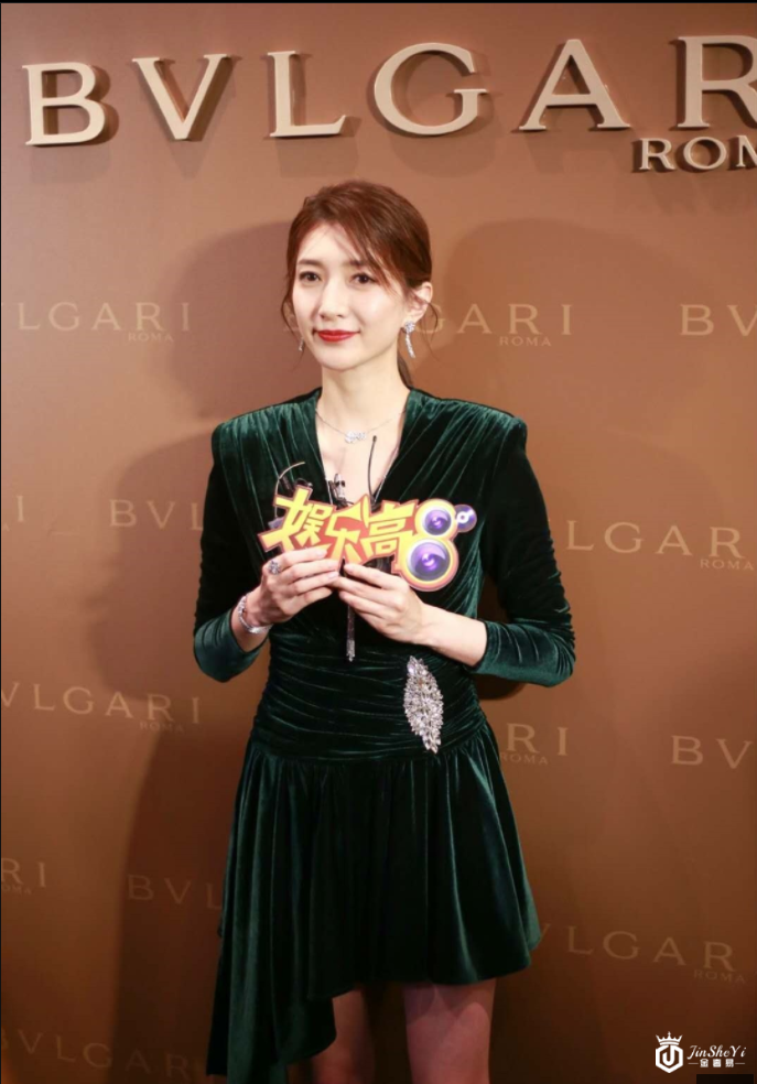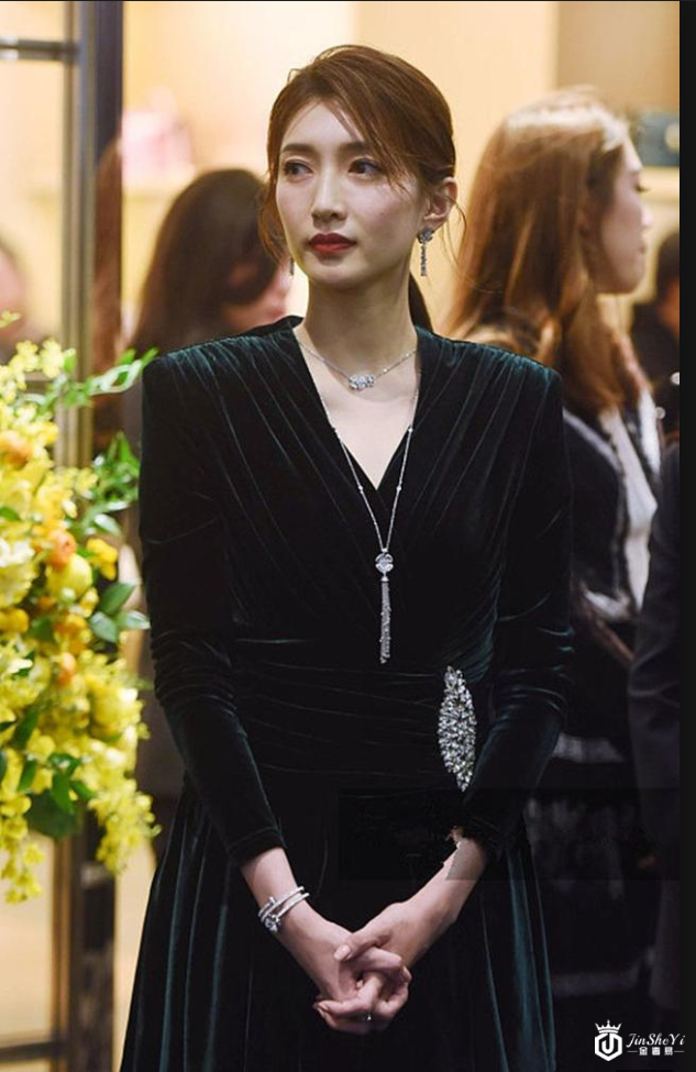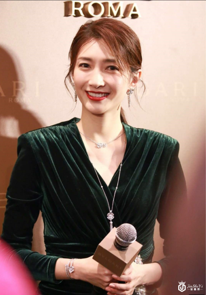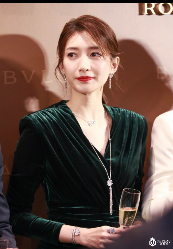 江疏影一身墨绿色丝绒不规则裙配低马尾,知性优雅,一抹红唇美艳无比!